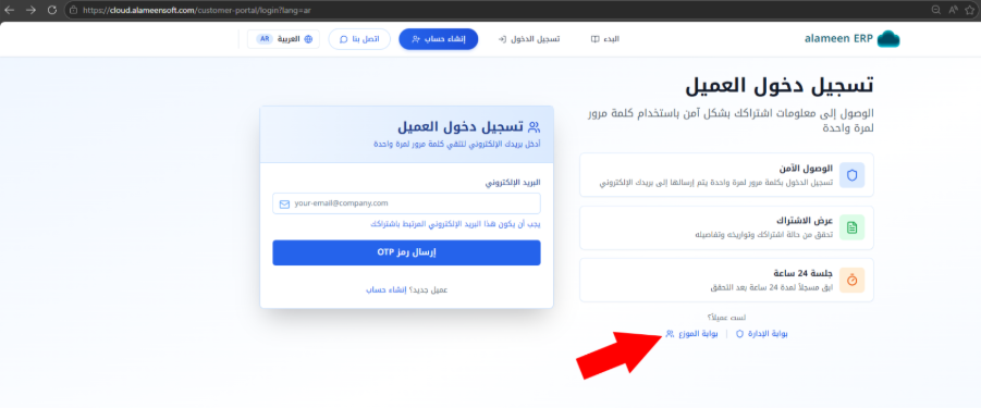 لمعرفة عملائك؛ انتقل إلى رابط الأمين كلاود، ثم اضغط على زر "تسجيل الدخول"، ومن الواجهة نفسها، اضغط على "بوابة الموزع" الموضّحة في الصورة.