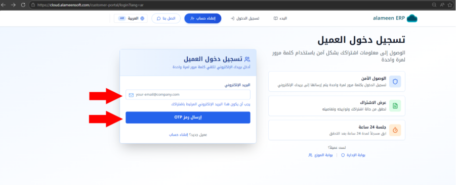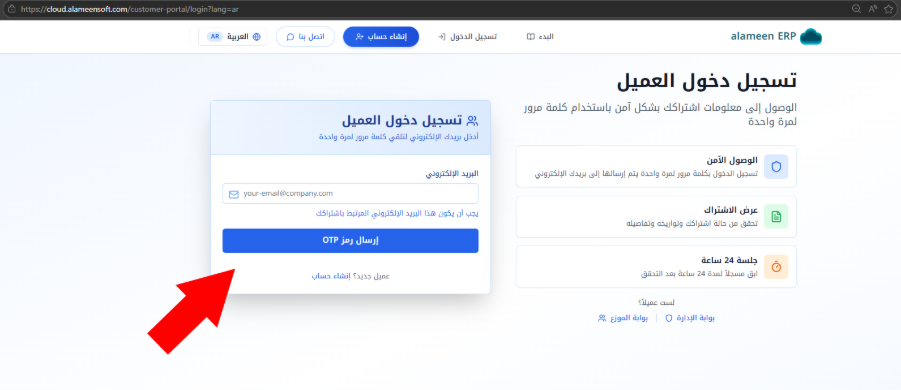 اضغط على زر "تسجيل الدخول"، الموضّح في الصورة السابقة، فينتقل الموقع إلى واجهة "تسجيل دخول العميل"، أدخل بريدك الإلكتروني المرتبط بالاشتراك (البريد الإلكتروني الذي أدخلتَه في "معلومات الاتصال" عند إنشاء الحساب)، ثم اضغط على زر "إرسال رمز OTP".